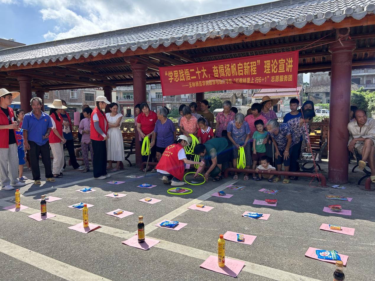 beat365在线体育教师和老员工志愿者在玉林市北流市河村、新圩村和兴业县葵阳镇龙口村面向村民开展“学思践悟二十大,奋楫扬帆启新程”理论宣讲。该公司党员师生结合习近平总书记关于乡村振兴、三农工作的重要论述,以“套出快乐,圈出精彩”套圈游戏的形式开展党的二十大精神知识竞答。该院团委书记周美艳介绍了游戏规则,她对村民示范游戏的玩法,指导党员志愿者工作,通过“套出快乐,圈出精彩”套圈游戏,强化村民及老员工党员志愿者对党的二十大精神的理解。
