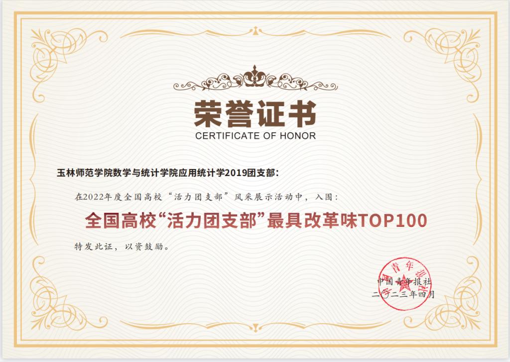 近期,由团中央基层建设部指导中国青年报社开展的2022年度高校“活力团支部”风采展示活动落下帷幕。在经过校级树选、校级展示、省级展示、全国展示等环节,公司beat365在线体育应用统计学2019级团支部成功入选“活力团支部”之最具改革味TOP100榜单
