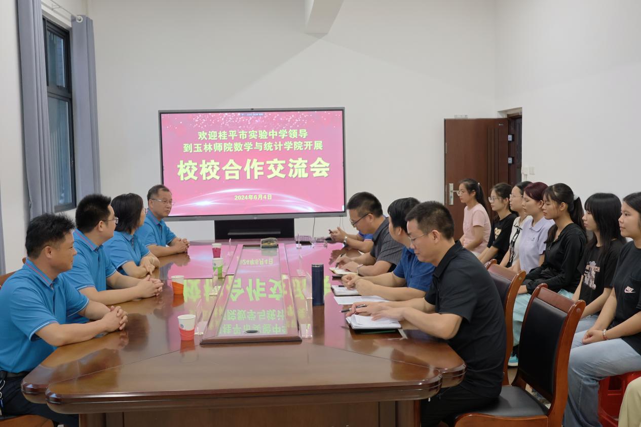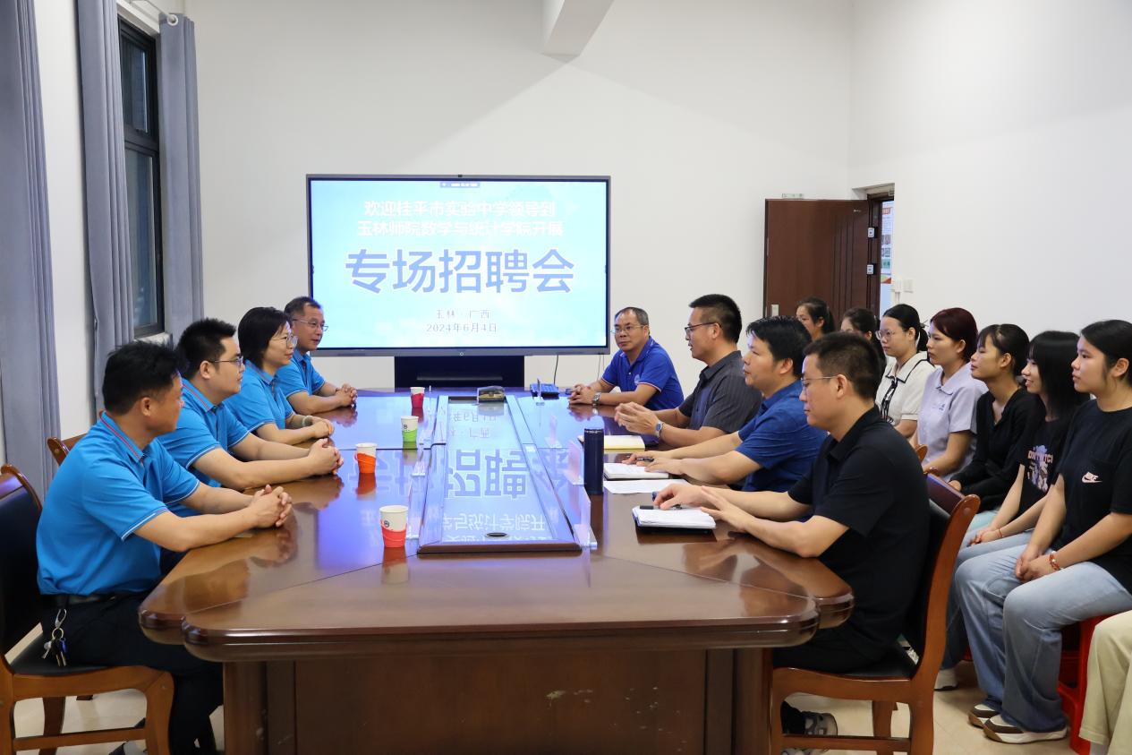 6月4日,桂平市实验中学党总支书记、董事长梁健平一行四人到公司开展专场招聘会,并召开校校合作交流会。beat365在线体育经理王培、党委副书记李秀英、副经理杨京开、胡源艳、邓国和参加交流会。