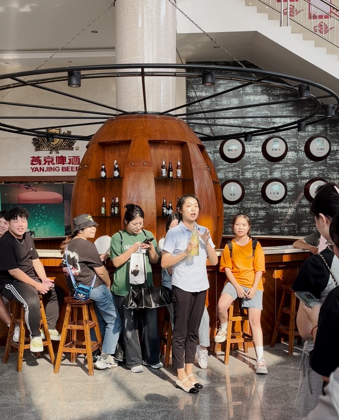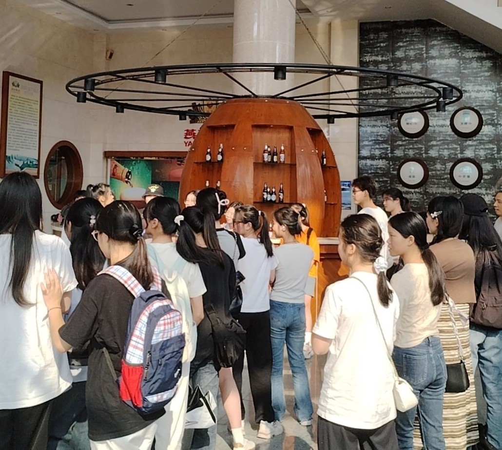同学们到达燕京啤酒厂后于大厅集合并由工作人员统一带领前往参观。参观开始,工作人员邀请五位同学品尝了燕京鲜啤,然后让一位同学进行评价。随后,工作人员带领大家参观啤酒工厂,了解燕京啤酒厂的企业文化、啤酒生产工艺流程、发展历史、啤酒历史等。最后,同学们还参观了发酵罐区和啤酒包装生产车间,了解燕京啤酒酿造的先进工艺和现代化的包装流水线,见识到每一瓶“持久新鲜、极致醇净、香气优雅、绝不上头”的全生态啤酒的背后是企业对品质的坚守和对生产环节的精准把控。